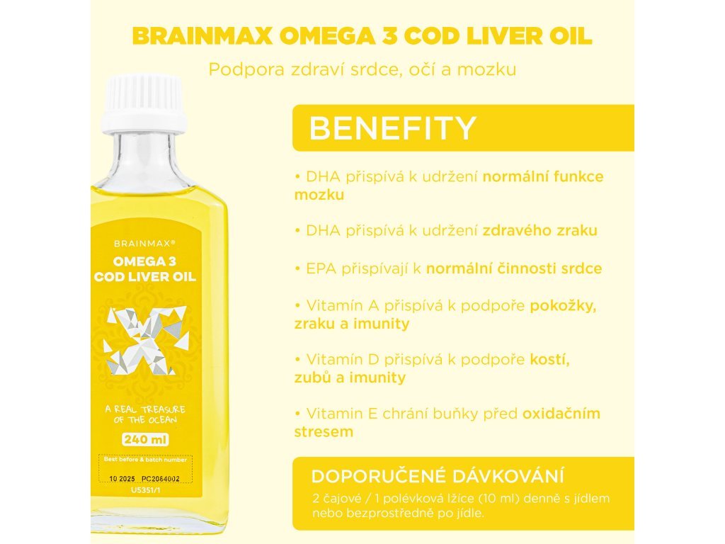 BrainMax Omega 3 - Olej z treščej pečene, citrón, 240 ml Islandský olej z pečene tresiek pre mozog, srdce a imunitu