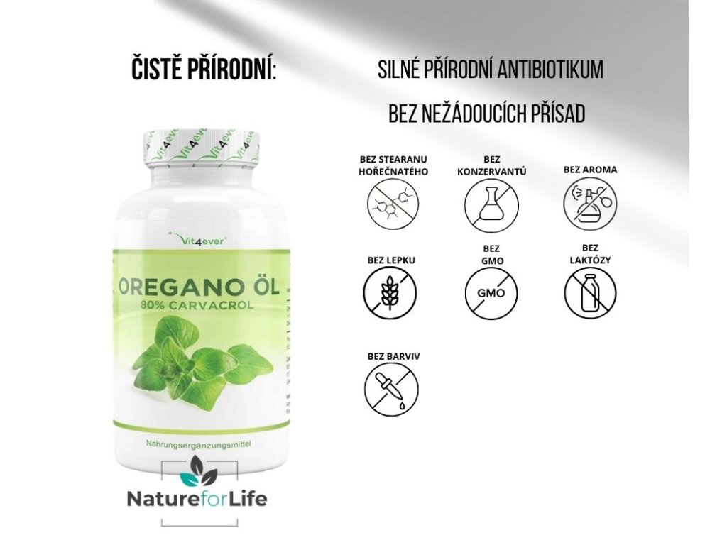 - Vysoká dávka 150 mg oreganového oleja v jednej kapsule s obsahom 80 % karvakrolu.